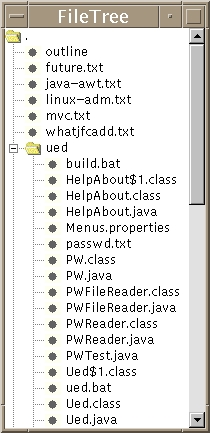 How does the data get into the table? The nice thing about JTable is that it specifies a helper class called a JTableModel, which is the interface between your data model and the JTable. Once we have a data model based on PW objects as described above, the JTableModel need only obtain the individual fields for the table and return them to the JTable upon request. See source file UedTableModel.java, which is only about 40 lines long, most of it is just a switch statement. Again, JFC's object model makes code development easy.