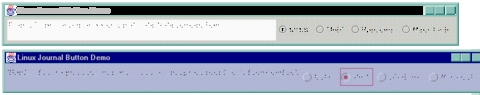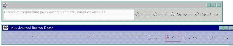 The action listener for each button just calls the UIManager class' setLookAndFeel method with the correct full class name and a utility class' updateComponentTreeUI passing in the top-level window (the JFrame subclass). This changes all components in the tree to display in the newly selected look and feel. Since some components may need a different size, we again call the JFrame pack routine, which computes the sizes of all components and makes the main window large enough to hold them all.