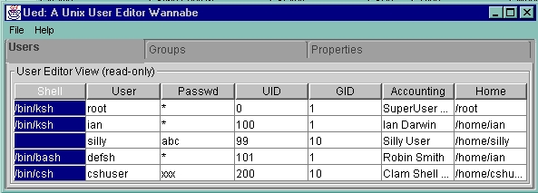 Since we want this to be a “good” application and maybe the basis for a general UNIX user database editor (read, write, validate) later on, we'll design it according to the model-view-controller paradigm from the start. I called this program Ued, originally in tribute to a much older program written at the University of Toronto around 1982 and maintained for a time by my colleague Geoffrey Collyer. My program has no code in common with that older ued. The class UedModel (see UedModel.java) is the user data portion of the program. UedView displays a list of users or groups on the screen. UedControl responds to user requests to modify the data. The main thing to note is the look-and-feel it presents (see Figure 5).
