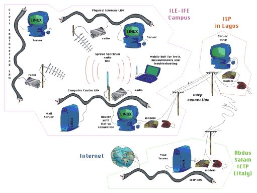 The success of the Ile-Ife experience stimulated cooperation with other Nigerian universities. A large program of cooperation with the National Universities Commission for the establishment of a national academic network started in 1996 and is still progressing. Linux is part of the technical basis of this activity. The most interesting applications of radio have been in individual universities. Among these is the Bayero University (Kano) which decided to build a link to connect the new campus with the old campus of the university (about 9 kilometers). This connection was implemented using commercial wireless equipment and two Linux machines as routers, with one of them as the whole university mail server and uucp gateway.