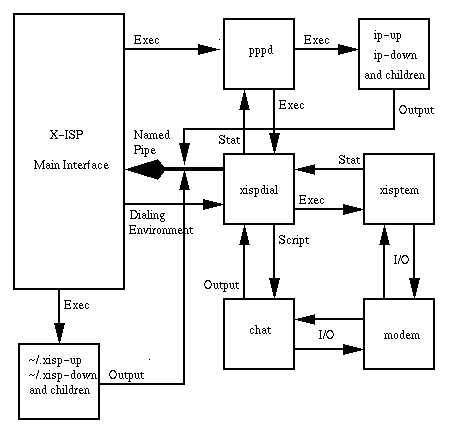 X-ISP adds two helper modules called by pppd (see Figure 1). The first, xispdial, takes care of the dialing. xispdial sits between pppd and chat and is used by X-ISP to start the connection. xispdial reads an environment file residing in the user's directory. After getting the information for the ISP selected, it calls chat to make the connection. Once connected, control of the modem is turned over to the second module, xispterm. This terminal program allows the user to log in to the system manually, or in the case that ip-up/ip-down scripts exist, xispterm runs those scripts. X-ISP also runs user-specific scripts, .xisp-up/.xisp-down, which reside in the user's directory and provide increased versatility.
