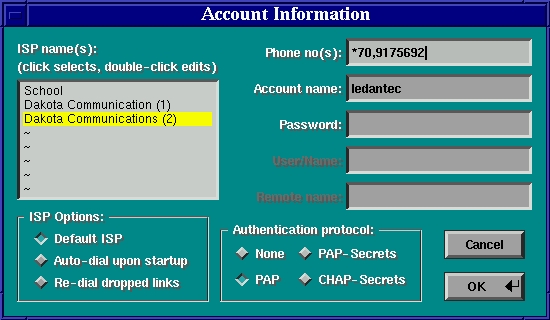 For PAP authentication, X-ISP calls pppd with the +ua option. PPPD version 2.3 no longer supports the +ua option, so if you are using that version of pppd, the PAP authentication mode will not be available. X-ISP creates a temporary file with login details in the user's home directory before calling pppd during a connect request, then removes the file as soon as the connection is established. This prevents any plaintext files with login details from sticking around. For PAP/CHAP-Secrets login, the appropriate files must be edited aside from X-ISP.