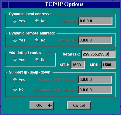 The final item, “TCP/IP Options”, sets up Network Addressing. The most notable point here is the “Support for ip-up/ip-down” scripts. If set to “yes”, the DNS addressing can be set for each account, providing great flexibility when maintaining multiple accounts by dynamically updating the /etc/resolv.conf file. (See Figure 4.) When using ip-up/ip-down, X-ISP sends the ipparam option to pppd, which passes a string to ip-up/ip-down containing the pipe name for X-ISP, the description set in Account Information, and if set, the DNS addresses specified. X-ISP will also display any information from ip-up/ip-down on the terminal window via the named pipe.