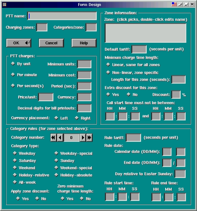 This should give you a good start with X-ISP, as well as a little insight into how it works. In the next release of X-ISP, a PTT editor will enable users to add entries to the TelCo database. The PTT information editor envisioned for X-ISP version 2.4 enables editing of all tariff rules for PTTs known to X-ISP, and also adding your own PTT information through a versatile GUI interface. The fields of the editor pop-up window shown in Figure 6 are the result of analyzing the PTTs currently known to X-ISP (version 2.3p7) plus a handful more which haven't yet made it into the distribution.