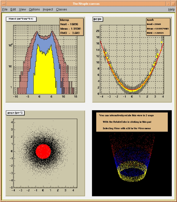The ntuple1.C macro uses the database created in the previous macro. It creates a canvas object and four graphics pads. In each of the four pads, a distribution of different Ntuple quantities is drawn. Typically, data analysis is done by drawing in a histogram with one of the tuple quantities when some of the other quantities pass a certain condition. For example, our Ntuple contains the quantities px, py, pz, random and i. The command: