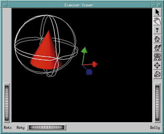 root->addChild(new SoTrackballManip);To be sure I was making the cone rotate, I moved it off to the side using mouse button two, and turned on the origin's three axes display using the pop-up menu of mouse button three.