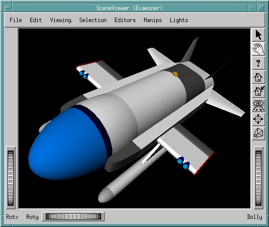 This program can be enhanced to allow more than the viewpoint to change by adding a manipulator. Using SoTrackballManip provides the ability to interactively rotate an object about its own center on any of the three axes, as shown in Figure 2.