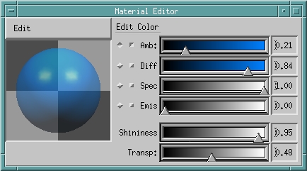 Editors for materials, directional lights, transformations and other node properties can be attached to the scene graph, and changes rendered interactively in any of the standard editor viewers. These editors come in source form, so they can be customized to suit the user's specific needs.