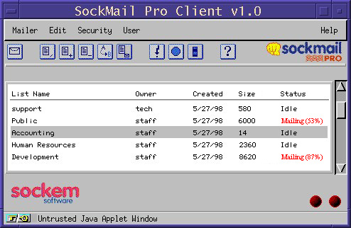 Smart companies on the Internet are replacing expensive paper mailings with digital mailings whenever possible. It looks antiquated when a company—especially one in the computer industry—sends me a press release by mail. Doing so reflects poorly on its understanding of technology. Physical goods can't be delivered digitally, but information is destined to be transmitted like e-mail: effortlessly and inexpensively. However, many businesses are already having a difficult time managing the flow of e-mail and can easily have numerous mailing lists with thousands of addresses. Sockem Software's first product, SockMail, was created to help organizations effectively use lists of e-mail addresses. SockMail is described by its creators as a “100% Java client/server e-mail list management system”, and it is just that. Web sites overburdened with extensive lists of e-mail addresses will find this application valuable.