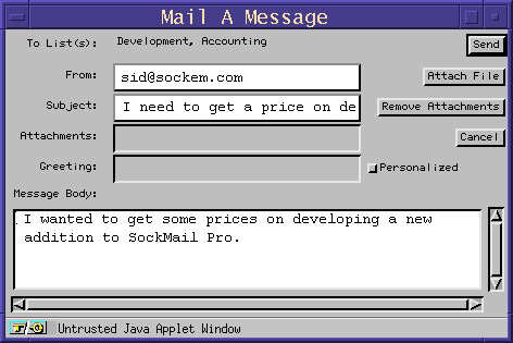 To deliver client applets, the SockMail server must be running on the same computer as a web server, which limits its scalability. SockMail Pro, due out soon, will be able to run independently of a web server. The SockMail server has its own 100% Java database used to store e-mail addresses. It is a proprietary database without JDBC (Java database connectivity) functionality which could lead to problems in an enterprise setting. The server processes all requests from clients to add and delete names from lists and must have access to a local JVM (Java Virtual Machine). Although the server component is 100% Java, it can't function on most Windows 95 or Macintosh desktops, because most JVMs for Windows 95 and Macintosh don't support the TCP/IP socket connections the SockMail server needs. Security must be set up once the server is installed. Security features include an administrative login, IP filtering and separate administrative port. Only one user login is allowed. The server can handle multiple tasks, simultaneously updating one list and mailing to another.