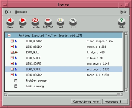 In addition to several memory leaks, Insure++ found a bug in the program related to using NULL pointers. It complained about this line:
