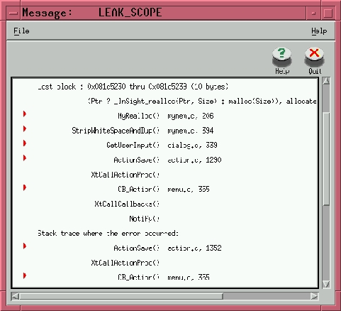 1349 break; 1350 } 1351 } 1352 }There is no code in ActionSave to free the memory pointed to by name. When we leave the function ActionSave and the local variable name ceases to exist, there is no way to access this memory anymore—it has been leaked. Insure++ is warning us about this situation.