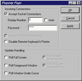The Linux VNC viewer requires no configuration to use. However, the Windows VNC server does require some minor configuration. To bring up the configuration window, either right-click on the WinVNC icon in the Windows NT/95 system tray and select Properties, or open a DOS command window and type: