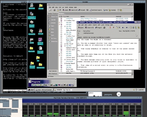 When using the Java VNC viewer, a system administrator can control a Windows 95/NT, Macintosh, or UNIX desktop from anywhere in the world using a Java-enabled browser. The VNC server can be configured so that all incoming viewer connections will be able to see the desktop but will not be able to move the mouse or type anything (a read-only connection). This option comes in handy in a teaching environment, where each student in a class connects to the instructor's “desktop” and watches a demonstration on his own computer rather than on an overhead connected to the instructor's computer.