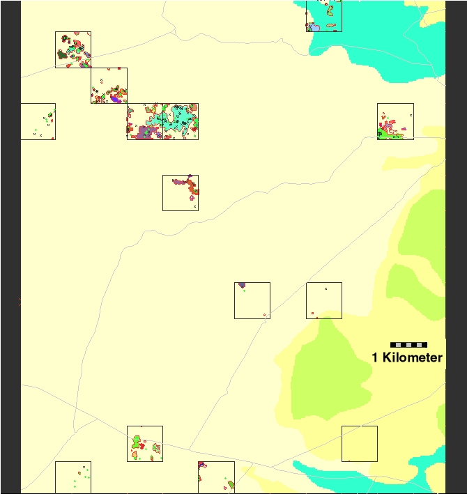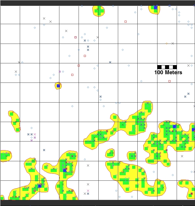 Fieldwork proceeded rapidly. Each of the 180 square kilometer survey areas was divided into a grid of 16m2 “cells” which matched the size of the analysis raster cells within GRASS. Figure 1 shows the results of a single km2 survey unit, displaying artifact distribution, site boundaries and a 100-meter grid. The site boundaries were created using the GRASS module r.to.vect. The map output was created in a script file that can be sent to the screen or the printer. The size of the cells, 16m on a side, was a trade-off between the desire for precision (smaller units) and efficiency (larger units). Field crews would traverse these survey areas using 1:3,000-scale aerial photographs with the 16m2 grid superimposed on the photo. The detail of these air photos allowed the crew chief to navigate to near sub-meter precision quickly and consistently. As the crews walked through the survey areas, crew members would call out when they had spotted an artifact or feature, and the crew chief would then call back the corresponding row and column number for that “cell”. This information was then noted on a data recording form. In the lab, this information was checked for accuracy and errors, entered into a DOS-based data file (on a 386 with 40MB hard disk and 2MB memory salvaged from the scrap heap), then migrated to the Linux environment.