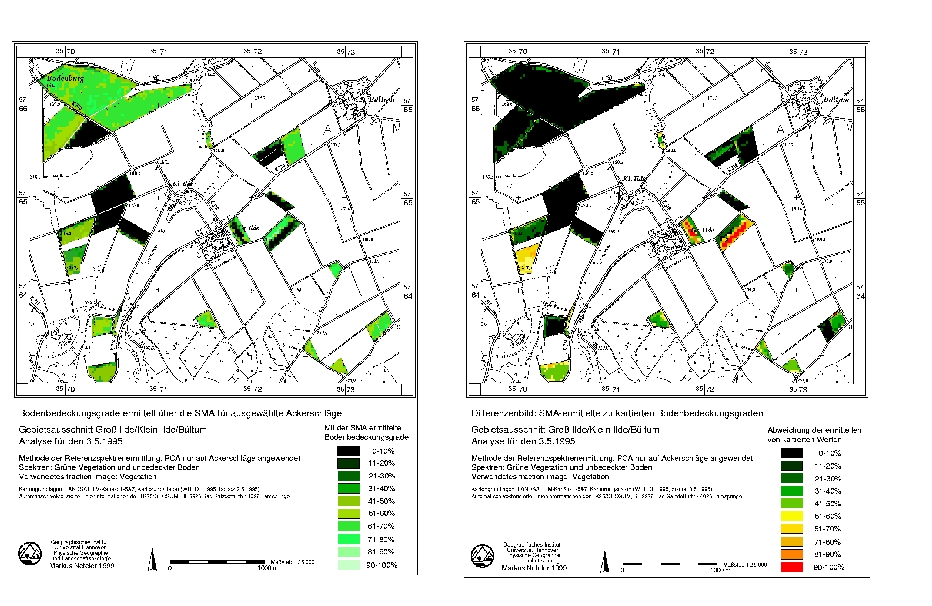 The current release of GRASS 4.2.1 now comes with more than 350 modules. In addition to standard GIS functions for raster, vector and point data, it offers statistical and image processing capabilities. Markus has recently written an algorithm, called “spectral mixture analysis”, that performs sub-pixel analysis and true coverage degrees in percent. Figure 3 shows the results from a module for GRASS that allows the user to perform sub-pixel analysis on vegetation and soil types with the spectral mixture analysis module. The left map shows the covered soils in percent. The right map shows the difference between a remotely sensed image and ground-truthed imagery. Black indicates no difference, red indicates high difference. Known field errors account for the red in the middle. This module can be used for geological analysis as well as detection of minerals based on their spectra. The vector lines in this image were created using the module r.line on the remotely sensed image, which was much faster than digitizing. This figure was created using xfig, a free drawing tool with good map scale features. xfig is supported in GRASS through a vector and raster exporting module. GRASS users can also rectify off-nadir aerial images taken with a hand-held camera from a small plane and convert them into quasi-orthophotos usable for area or distance calculations or mapping purposes. An overview of Linux GRASS, the tutorials and sample data are also available from Markus's University of Hannover, Germany, web site at www.geog.uni-hannover.de/grass/welcome.html.