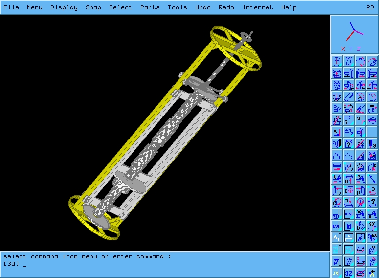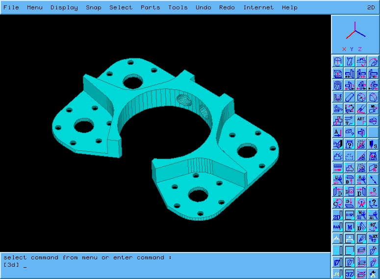 The command line at the bottom of the window reminded me of AutoCAD, but that is the only resemblance. The acronyms varied from those I knew in AutoCAD. Selecting a menu item or icon causes the associated acronym to be displayed on the command line. Commands can also be entered manually using acronyms. Additional parameters are either entered as single letter, digit or symbol options, or by interactive selection of drawing and solid objects.