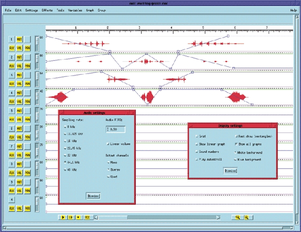 Most, if not all, SGI audio applications make extensive use of the excellent audio and audiofile libraries supplied with IRIX. The audiofile library provides an API primarily designed to allow effortless loading and saving of AIFF audio files. The audio library is designed to allow straightforward audio input and output as well as control global audio settings. In order to make porting as painless as possible, replacement libraries had to be written for the Linux operating system.