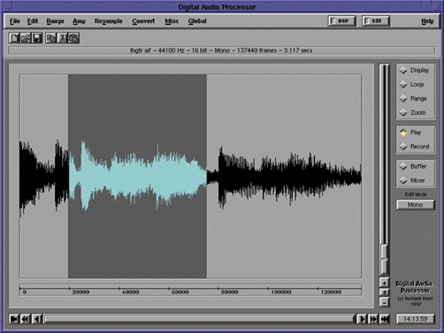 Looking over an excellent web page dedicated to SGI audio applications (maintained by Doug Cook), I noticed a sound-file editor named DAP (Digital Audio Processor), written by Richard Kent. DAP uses the XForms libraries, so I inquired about the possibility of a Linux port. Richard informed me that he had already written such a port, and when I mentioned I wanted to port some other software written for the SGI to Linux, he graciously supplied the code used in DAP to replace the SGI audio and audiofile libraries and headers. The Linux versions of libaudio.a, libaudiofile.a and their associated header files are virtually direct “plug-in” replacements, meaning I could leave the NoTAM sources relatively intact.