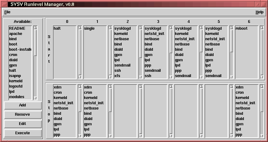 For those who find editing links to add or delete scripts in any particular runlevel a tedious task or who are just not comfortable doing this, Red Hat distributes a program called tksysv. This program uses a graphical interface (using Tcl/Tk) to read the script names in /etc/rc.d/init.d and displays them on the far left side of the application box. If you have a system with init.d in a different location, you can install symbolic links (for each of the rc#.d directories) and it will function just fine, or hack the script and customize it to your system. The system also reads the links in each of the rc#.d subdirectories and displays them for each runlevel from left to right with start scripts above and kill scripts below. (See Figure 1.) You can add, delete and even change the order of execution as you see fit.