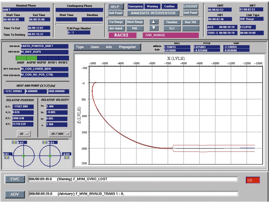 Mission Replanning: the purpose of this function is to support the operator intervention when the mission needs to be changed. It is a feature not present in RACSI—an astronaut cannot replan a mission; only the ground control center can. The Replanning function is launched on request. It supports the ground operator in the definition of a new mission plan according to three items: replanning scenario, mission constraints and status of the chaser equipment. This function can be run in automatic mode (the computer replans a whole new mission without operator intervention), semi-automatic (the operator is asked for some parameters) or manual (the operator constructs the maneuver sequence step-by-step). Visual information is constantly displayed to the operator.