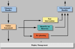 GOAS can run with two or three monitors at the same time, allowing the viewing of many spacecraft parameters. It is possible to configure a different monitor to display the man-machine interface of the monitoring, failure detection, replanning modules, etc. Like RACSI, the software of GOAS is subdivided into several modules (see Figure 5), according to a modular architecture compliant with ESA software standards. However, GOAS is much more complex in terms of mission planning capabilities, trajectory prediction and failure detection and recovery.