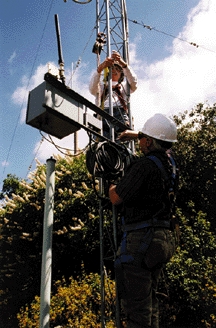 The gateway would require additional functionality for the field trials. To properly evaluate the data gathered from the sensors, data had to be recorded somewhere. The system specifications called for data to be delivered in real time to a central server that would record it, perform data analysis and, if necessary, send an alarm to the electrical system operators. Any failure of the links from the gateway to the WAN or a WAN outage would break the entire process and risk data loss. In fact, the times when the most interesting data is collected—during storms—is the very time links are most likely to fail. Obviously, the gateway must have redundant links and the ability to log sensor data locally, should all links fail. The hilltop had a direct line of sight to a local PG&E office and a few spare telephone wire pairs. For the primary link, we used a commercial spread-spectrum, point-to-point radio bridge. (Similar radios were already in wide use in the company as WAN links.)