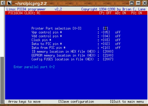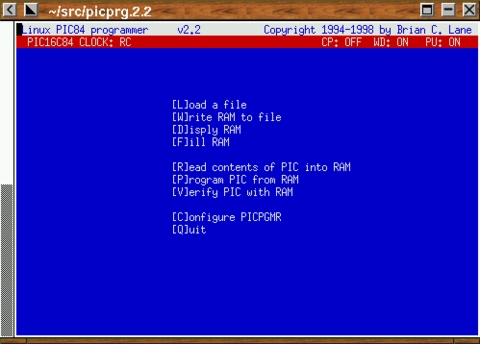 When I first started using the PIC16C84, a compiler was already available for Linux, but no Linux software ran the HOPCO programmer that I use. An easy way to solve this problem would have been to get the DOS software included with the programmer to run under DOSEMU. Since I never seem to pick the easy way, I decided to write a native Linux PIC programmer. I decided on a full-screen ncurses interface, which would run on a VT console or an xterm as long as the TERM environment variable is set to xterm-color.