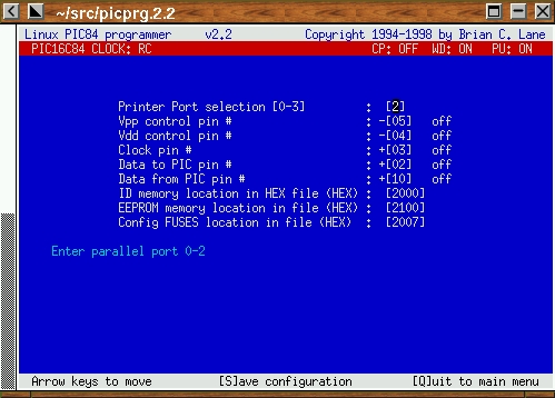 The first time picprg is started, you must pass it the number of the printer port (/dev/lpX) to which you have attached the programmer. I have my modified HOPCO programmer attached to /dev/lp2, so I run picprg -p2 to start it for the first time. You will see a nice blue screen (I'm still addicted to the color scheme of my Atari 800) as shown in Figure 1.