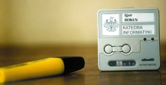 An active badge periodically transmits an infrared message containing a globally unique code (a badge identifier) using a data-link layer protocol running over an RS-232/422 network. The messages sent by the badges are received and queued by sensors. A poller periodically polls sensors and retrieves badge messages from the sensor queues. Each message and the identifier of the sensor that received the message is forwarded to the software part of the Active Badges system. The software layer maintains a database that maps sensors to places where sensors are installed, and badges to the users wearing them or the pieces of equipment to which they are attached.