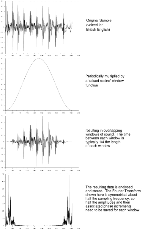 analyse reads the sample file and breaks it up into overlapping windows of about 10ms in length. This window length was chosen because evidence suggests the ear is insensitive to spectral changes on a shorter time scale. Each window is Fourier-transformed, producing an array of spectral samples (see Figure 1), but instead of simply storing the amplitude and phase of each Fourier result (bin), the amplitude and phase change per window are recorded.