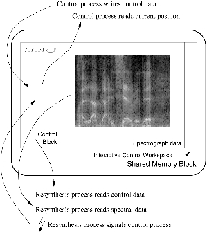 The prism application has two processes which basically operate asynchronously. Essentially, the resynthesiser has to keep running and producing audio samples regardless of what the user is doing with the mouse. For this reason, the second method of IPC, shared-memory or System-V IPC, has been used. System-V IPC also provides methods for process synchronisation: the semaphore. One can raise or wait on a semaphore. Think of it as a special kind of variable which behaves in the following manner. If one or more processes are waiting on a semaphore, raising it enables exactly one of those processes to proceed. If no processes are waiting, then the value of the variable is incremented. Waiting on a non-zero semaphore decrements its value but allows the process to continue immediately. Waiting on a zero-value semaphore adds the current process to a (possibly empty) list of waiting processes, pending the semaphore being raised by another agent.