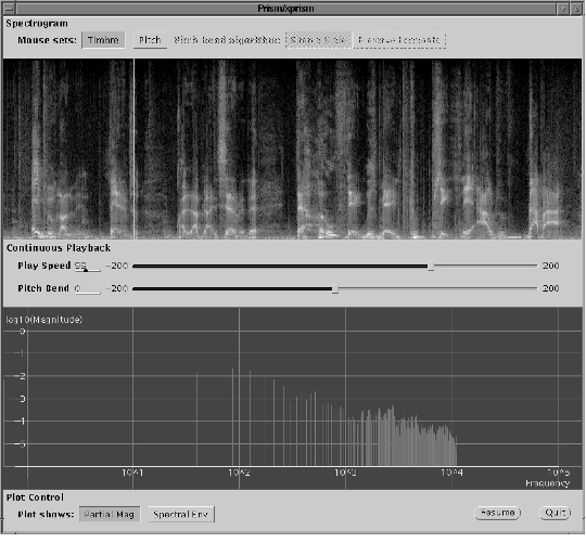 The Phase Vocoder in Sculptor comes in two parts: a batch-mode analyser called analyse, and a real-time synthesiser called, perhaps more imaginatively, prism. analyse reads an input file in Sun/NeXT audio format. The sample rate we use most often is 22,050 samples per second, as my P120 machine at home can comfortably keep up with this resynthesis rate using floating-point arithmetic with enough power left over to see to the work of running the X Window System interface. Samples can be acquired in the usual way using a command-line recording tool, but finding that rather tedious, we wrote Studio (see Resources) in Tcl/Tk to make the process of acquiring short samples more accessible.