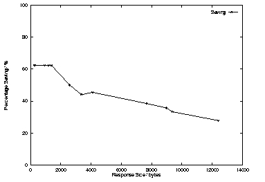 Figure 4 shows the percentage savings for the different packet sizes. The number of packets saved remains fairly constant, but because of the increase in the number of packets being exchanged, there is a decrease in the overall savings. This indicates that T/TCP is more beneficial to small data exchanges.