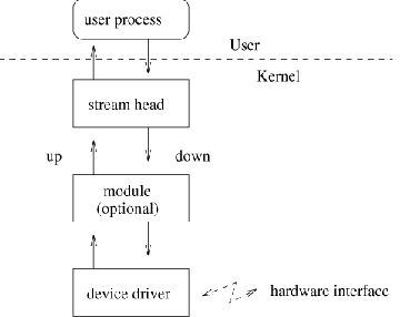 A mandatory STREAM driver interconnects the STREAM to the device sitting below it. STREAM drivers can also be software only; for example, a STREAMS driver could be used to implement an SNMP MIB for the kernel, or a driver could be written to emulate the behaviour of a true hardware driver for development purposes.
