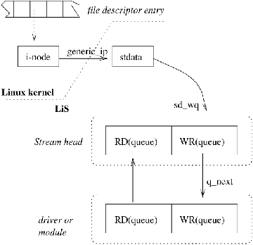 Consider this: Linux TCP/IP networking code can be used as-is with LiS. The purpose of LiS is simply to have the STREAMS framework available, not to replace the Linux TCP/IP protocol stack. Existing network software is perceived by STREAMS users as the dashed box in Figure 2. Fake modules interfacing with existing Linux drivers and protocol stacks are all we need.