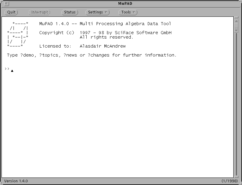 The interface is pretty clumsy compared with the lovely worksheet interface of Maple and Mathematica. The interface for MuPAD under MS Windows 95/NT is much more refined, but you have to pay for it. For this reason alone, I would say that MuPAD is not as well suited as its rivals for elementary teaching. It's nice to see input and output in different colours, and for mathematics output to be presented properly typeset. I also like having graphical output as part of the worksheet. Currently, none of these are possible in MuPAD.