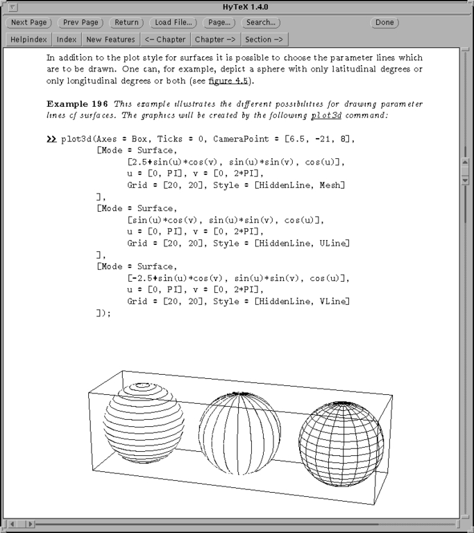 All the relevant documentation is provided in the form of hyTeX dvi files; that is, dvi files with embedded hyperlinks. If you are used to TeX and dvi viewers, this approach will seem very sensible: the mathematics is superbly typeset, as you'd expect, and there are plenty of included graphics. It may seem a bit odd at first to use a book (with all the trimmings: table of contents, chapters, an index) as the paradigm for on-line documentation, but in fact it works very well. And after all, everybody is familiar with the structure of a book, so there is no need to learn the particular exigencies and peculiarities of some new and strange help system.