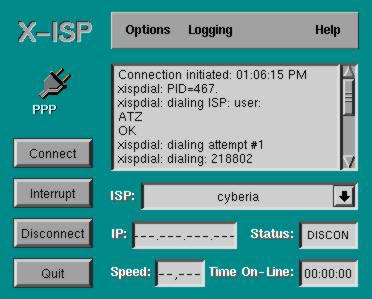 The user interface of X-ISP is very simple, intuitive and user friendly. It consists of a form with four buttons (Connect, Interrupt, Disconnect and Quit), three menus (Options, Logging and Help) and a drop-choice list of ISP entries (in case the user wants to configure the machine to dial more than one ISP). The “Options” menu contains the five items discussed below.