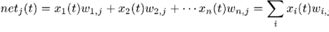 where j identifies the PE in question, xi(t) is the input at time t from the PE identified by i, and wi,j are the weights assigned to the connections from i to j.
