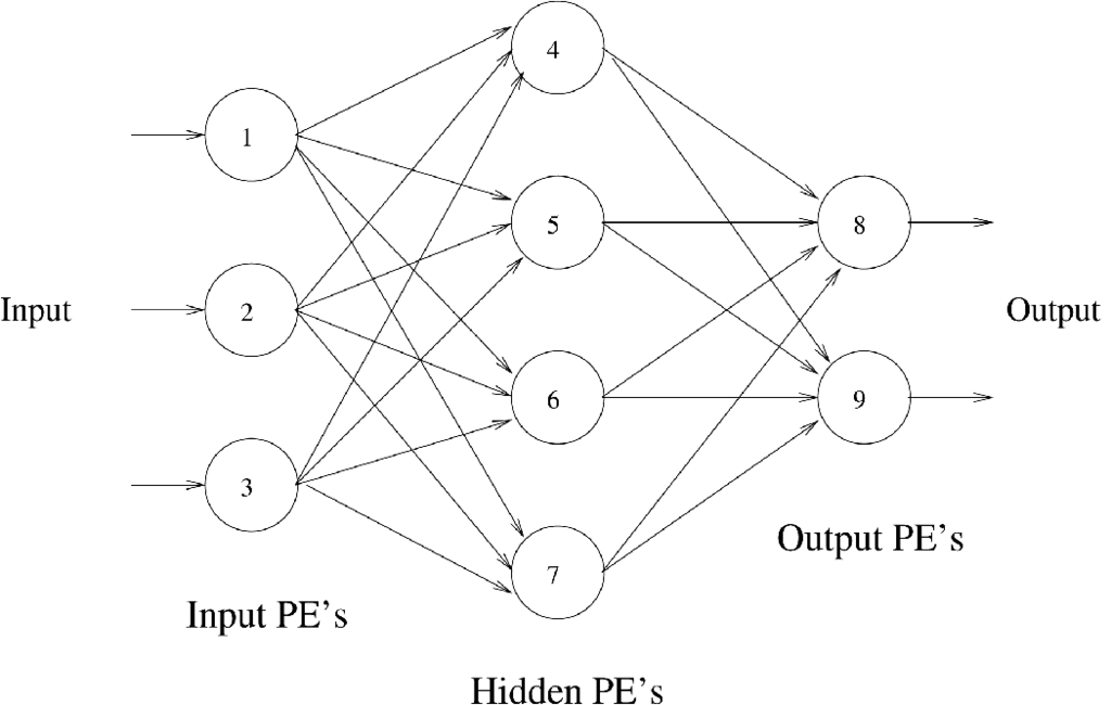 This network has input PEs (numbered 1, 2 and 3), output PEs (numbered 8 and 9) and hidden PEs (numbered 4, 5, 6 and 7). Looking at PE number 4, you can see it has input from PEs 1, 2 and 3. The activation for PE number 4 then becomes: