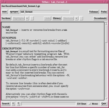 tkman displays man pages in a pleasant way (see Figure 1), knows hypertext links to other related man pages, allows regexp searches within the man page and has a built-in apropos command that offers man pages for a given keyword. If you want to read a man page from a specific section, you must add a dot and the section number in the command entry field; e.g., if you want to get help on the C library function printf (man page section 3) rather than the shell command printf (man page section 1), you must enter man printf.3.