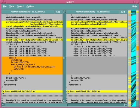 For programmers using a version control system, tkdiff by John M. Klassa is another useful difference tool. In contrast to mgdiff, tkdiff can be invoked only from the shell prompt because it requires file names as command-line arguments. tkdiff has an internal help function but no external man page, which occasionally makes it inconvenient to get usage information. Beside these trifles, tkdiff offers the same functionality as mgdiff. Moreover, you can check a file versus different versions of that file registered in a version control system (RCS, CVS or SCCS). For example, the command tkdiff -r filename compares filename with the revision most recently checked in.