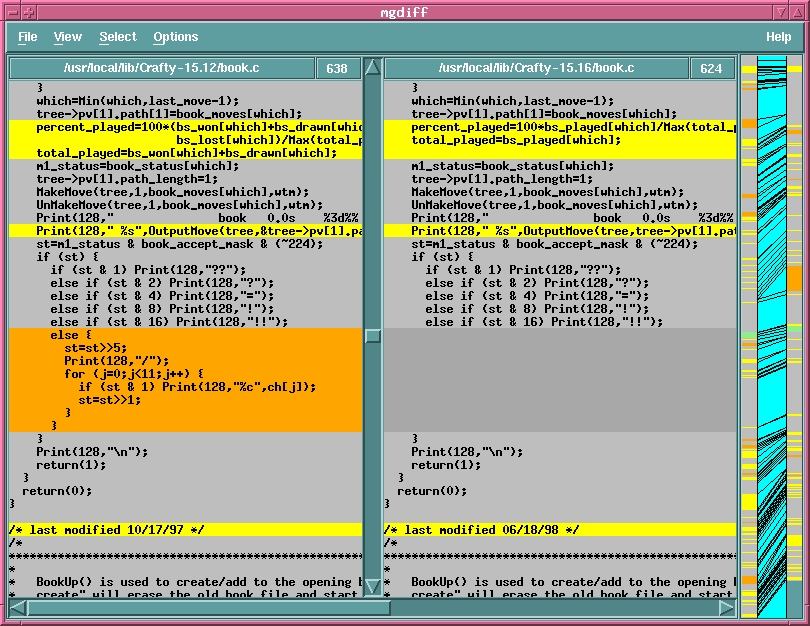 mgdiff by Daniel Williams can be invoked like diff with two file names as command-line parameters. Alternatively, it allows interactive file selection from the “File”->“Open” menu; hence, it is possible to invoke mgdiff from your window manager's program menu. mgdiff displays the selected files in two boxes and shows an overview of differences in a small bar on the right (see Figure 3). Changes, insertions and deletions are highlighted in different colors, which can be customized by the corresponding X-resources in your .xresources or .xdefaults file; see mgdiff's man page for details. Moreover, you can easily merge the compared files into a new file simply by clicking on the respective versions of the differences and saving the result with the “File”->“Save As” menu.