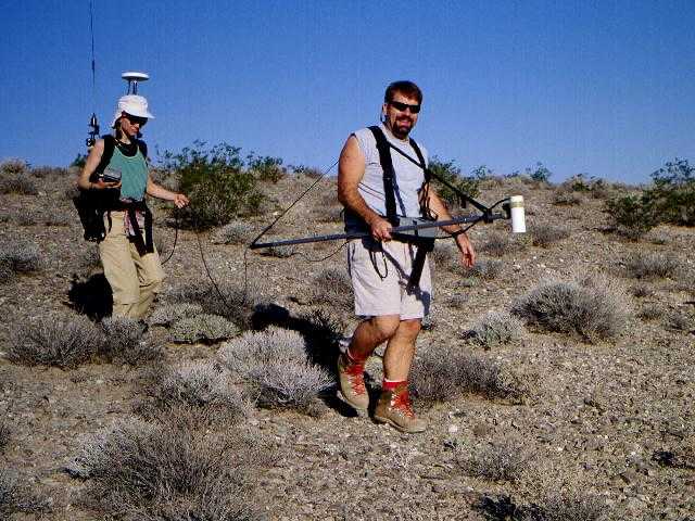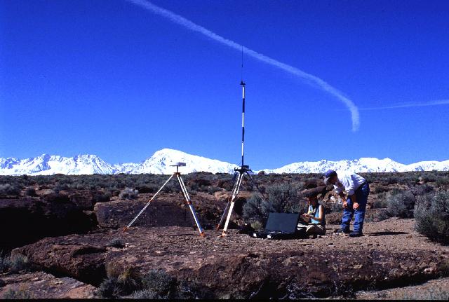 The cesium-vapor magnetometer is very sensitive, capable of measuring a change of one part per million in the intensity of the earth's magnetic field. This magnetometer can sample at very high rates, 1Hz to 50Hz. Such high data-collection rates are useful because we interface the magnetometer with a real-time kinematic differential GPS, capable of determining the mobile instrument platform's position every second to within several centimeters. This high accuracy is accomplished by using a stationary GPS base station to radio-telemeter location corrections to the GPS carried by the mobile survey team (Figure 7). Magnetic readings become interleaved with GPS location readings as the magnetometer's data collection facility stores the data from both instruments.