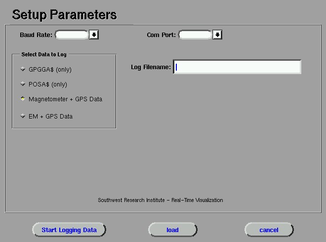 Simplicity and reliability are significant elements of the R-T-V base station. Physically, the base station consists of a 9600 baud, 2 watt radio modem, interfaced via a serial port connection to a 166MHz laptop computer with 24MB of RAM running Linux. The computer and radio are both powered by a 12-volt battery. The radio requires an antenna to provide line-of-site communication, sometimes augmented by a repeater, with the mobile survey team's radio. The R-T-V base station program waits for data at the serial port and selects, for visualization and processing, only those data strings tagged appropriately by the magnetometer and transmitter radio. Non-tagged or unrecognizable transmissions are discarded.