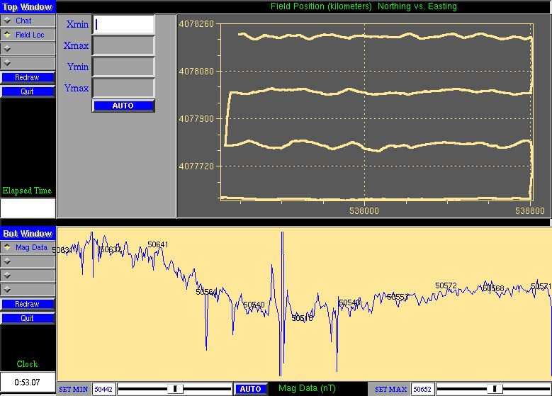 XForms, a graphical user interface (GUI) toolkit based on Xlib for the X Window System, was chosen as the GUI builder for the visualization. The use of XForms' strip-chart object and two-dimensional plot object facilitated rapid program development. The WYSIWYG (what you see is what you get) interactive form designer made it possible to visually construct each layout for the displays (Figures 8 and 9). A timed call-back routine specifies when to check the serial port for data. Mouse events are handled between serial port reads. This allows for simultaneous screen updates and GUI control, with no noticeable delay to the user. During a survey, magnetic reading failure at the magnetometer is indicated by the stopping of updates to the strip-chart display, and an invalid GPS position is indicated by a color change on the two-dimensional location map.