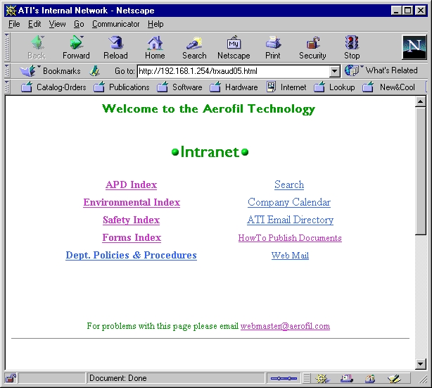 In June of 1998, the company hired a college student for the summer to assist in getting our existing documents on-line. Some of the documents were in a word-processor format, some were flowcharts done in Visio, and some existed only in paper form. Several methods were used to get this information onto the computer: scanning, converting to PDF format and coding in HTML. Basically, I set up various user areas to segregate the documents, such as Human Resources, Information Services, Aerofil Process Descriptions, Quality Control, Safety Process Descriptions, etc. Each area had security set up to ensure that only designated users could add or modify the information contained in it.