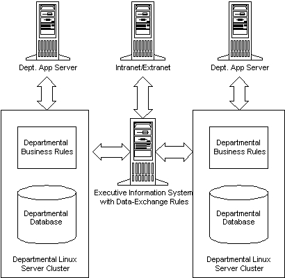 If a company has good operational practices, it does not need to go through the pain of remodeling itself in some other's image. Very often, a company's unique approach to business is part of its competitive edge. This is a strong argument for decentralized computing. If Linux is to use this argument, it will have to provide a powerful system for managing business rules and incorporating them into enterprise systems, as described in Figure 2. Note that once broken down to the departmental level, Linux has the capability and competitiveness to host all of the functions displayed. What is needed is the applications to fill in the blanks. The enterprise-class databases are coming, but the data-exchange management and executive information systems are a tougher proposition. For vendors to prepare such systems for Linux, a solid framework for business rules would probably have to be in place. This may sound easy enough to implement, but in its purest form, it is one of the holy grails of computer science. Research efforts ranging from graph theory to artificial intelligence have sought good ways to enshrine arbitrary business rules (or even just common-sense rules) into a computing framework. A system that could handle enterprise-class computing would need the ability to analyze business objects and apply various operations and constraints on them, as well as check pre-conditions, post-conditions and invariants. This is an area where the great problem-solving ability displayed by distributed developers such as Linux's can make strides.