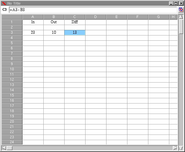 Formulas can also contain internal or external references to cells in two modes: absolute or relative. A dollar sign in front of a row or column name denotes an absolute reference (e.g., $B2, D$13, $A$1). Absolute references do not change in move operations (addition or suppression of rows or columns, cut-and-paste operations). Without a dollar sign, the reference is a relative one (e.g., B2, D13, A1). It can be changed by a move operation. The cell C3 of Figure 1 contains the formula =A3-B3, which represents the difference between the values of the A3 and B3 cells.